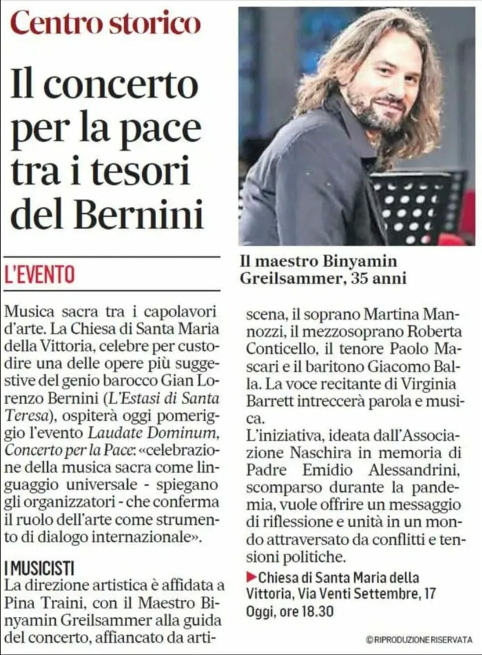 22 Sep 2025 Binyamin GREILSAMMER News Article à l’occasion du Jubilé du pape François, centre historique de Rome Il concerto per la pace tra i tesori del Bernini